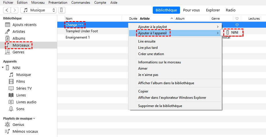 Dans iTunes : Sélectionnez les chansons que vous souhaitez ajouter à la bibliothèque musicale iCloud > Puis cliquez avec le bouton droit de la souris > Sélectionnez l'option Ajouter à l'appareil.