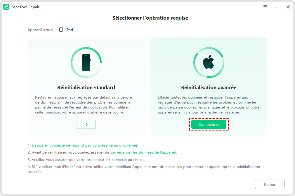 Étape 1. Lancez simplement FoneTool Repair, connectez votre iPad et sélectionnez la fonction Réinitialiser l'appareil.