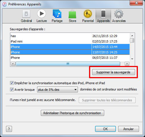 → Ouvrez iTunes > Cliquez sur Modifier > Choisissez Préférences... > Cliquez sur l'onglet Appareils > Sélectionnez la sauvegarde que vous souhaitez supprimer > Cliquez sur Supprimer la sauvegarde pour confirmer.