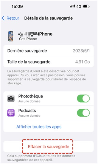 Allez dans Réglages sur votre iPhone > appuyez sur votre nom pour accéder à votre compte Apple ID > Accédez à iCloud > Gérer le stockage > Sauvegardes. Ensuite, choisissez un appareil et appuyez sur Effacer la sauvegarde.