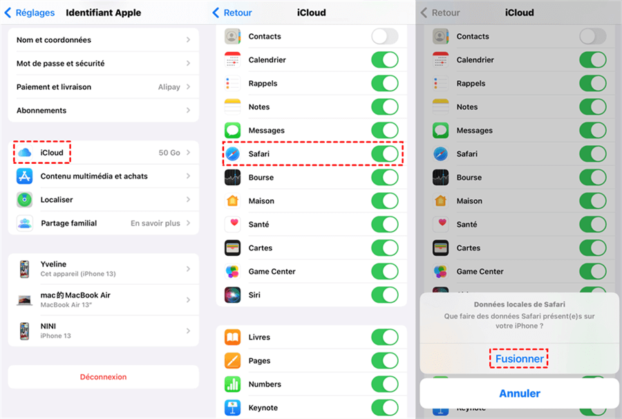 Sur votre iPhone, allez dans l'application Réglages > Cliquez sur [votre nom] > Touchez iCloud > Faites défiler vers le bas pour localiser Safari > Basculez sur le bouton à côté de Safari. Enfin, lorsqu'une fenêtre s'affiche, cliquez sur Fusionner pour permettre à iCloud de synchroniser Safari.