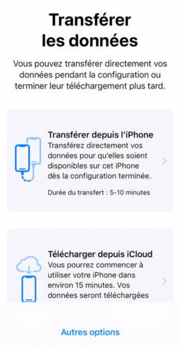 ✏️ Note : Vous pouvez également appuyer sur Autres options pour transférer les applications, les données et les paramètres à partir de votre sauvegarde iCloud la plus récente ou à partir d'une sauvegarde sur votre ordinateur.