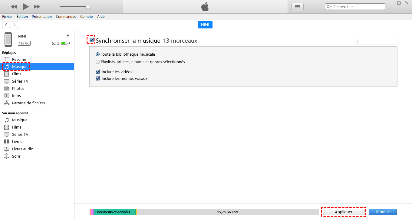 Étape 5. Cliquez sur Appliquer pour synchroniser la bibliothèque iTunes avec l'iPhone.
