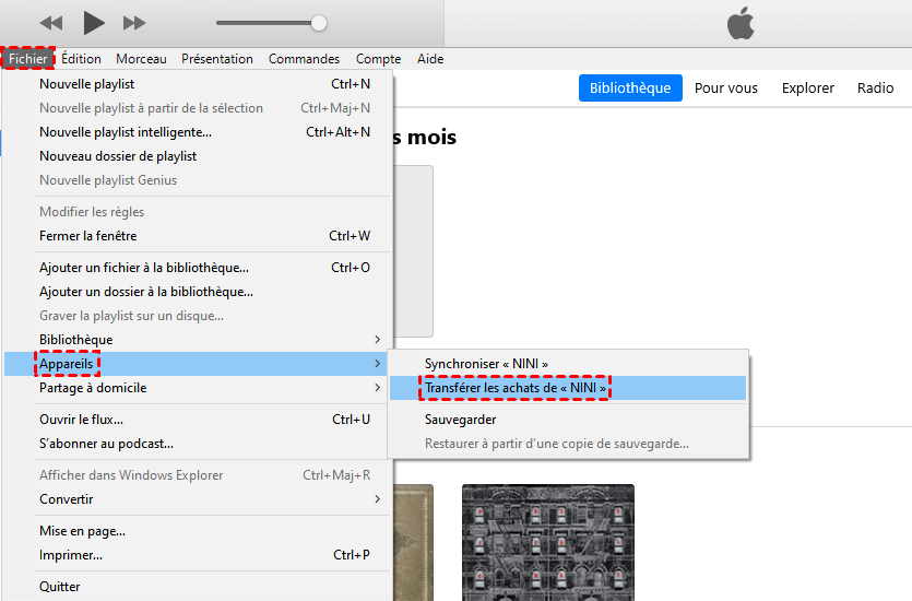 Branchez iPhone et ouvrez iTunes > Cliquez sur Fichier > Appareils > Choisissez Transférer les achats de [nom de votre iPhone].