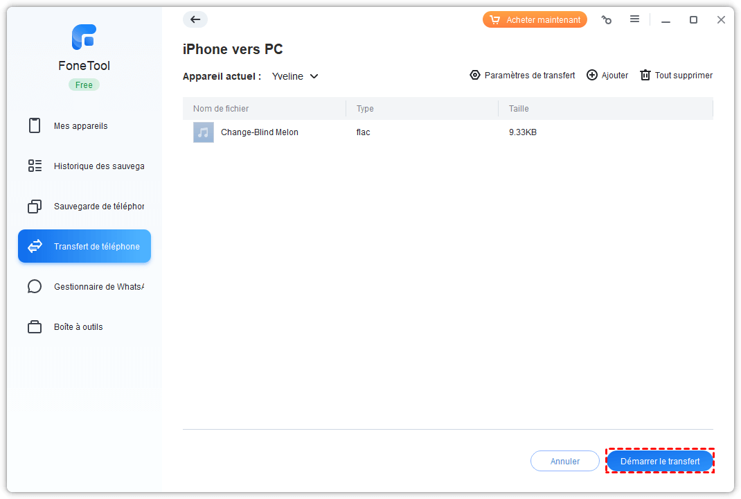Vous voulez transférer des chansons non achetées ? Il est recommandé d'utiliser un outil de transfert iOS professionnel comme FoneTool. Il peut vous aider à transférer la musique non achetée Phone vers PC. Outre la musique, il prend également en charge le transfert de photos, de vidéos, de contacts, etc.