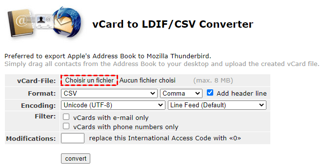 Allez sur le site de conversion de vCard en CSV : https://labs.brotherli.ch/vcfconvert/. Ensuite, cliquez sur le bouton Choisir un fichier pour sélectionner le fichier vCard que vous venez de télécharger depuis iCloud et confirmez les autres options :