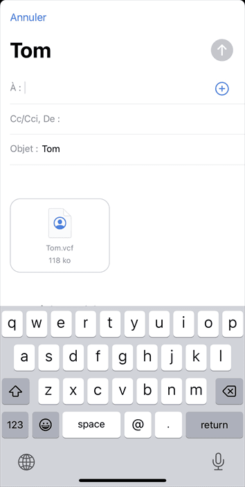 Sur votre iPhone : Ouvrez l'application Mail pour consulter l'e-mail > Touchez pour ouvrir le fichier VCF > Vous aurez ensuite la possibilité d'ajouter des contacts de l'e-mail à l'application Contacts. Choisissez ou Ajouter à un contact existant selon vos besoins.