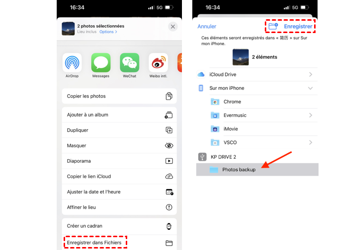 Étape 3. Appuyez sur votre clé USB > Choisissez un dossier pour enregistrer vos photos > Appuyez sur Enregistrer.