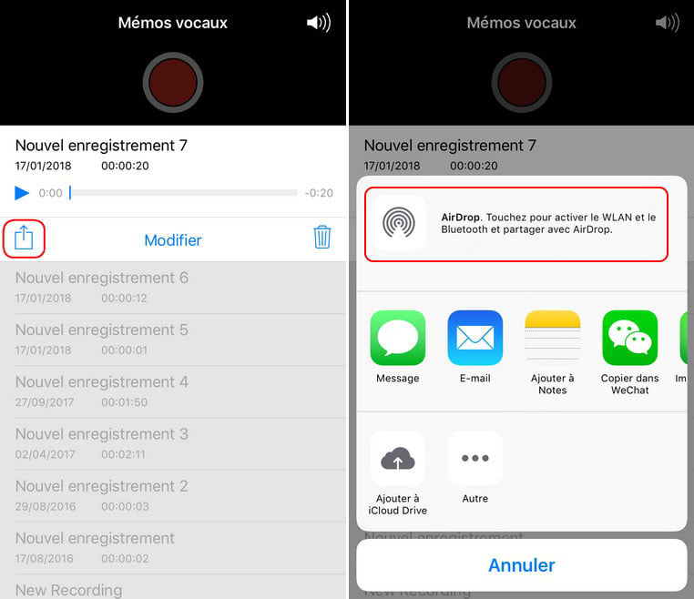 Si votre appareil cible est un appareil compatible AirDrop, comme un Mac, un iPad ou un iPhone, vous pouvez aussi envoyer rapidement des mémos vocaux avec AirDrop. Voici les étapes détaillées :