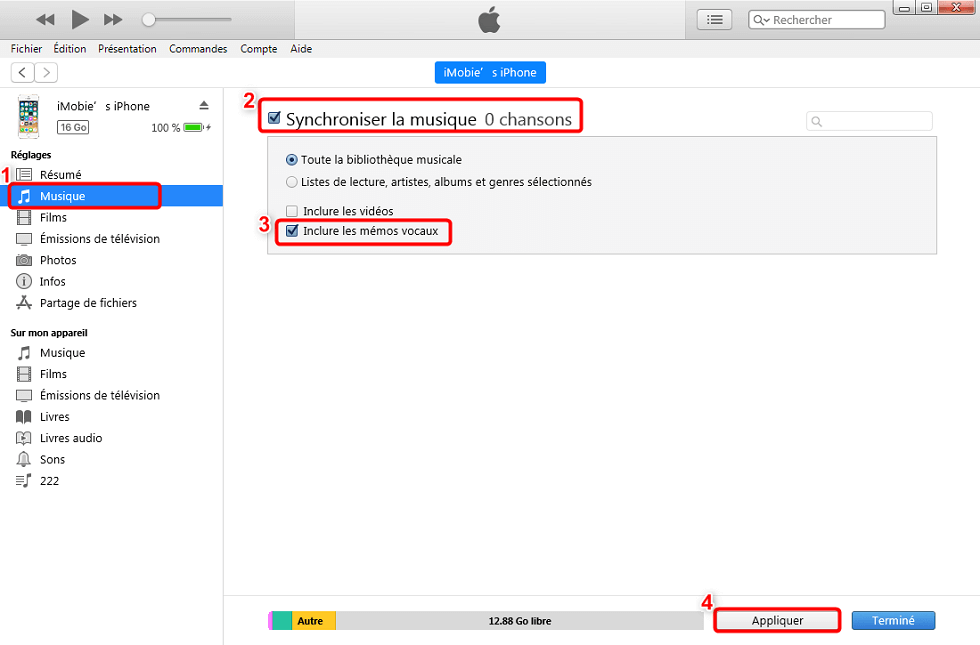 Connectez votre iPhone à l'ordinateur > Ouvrez iTunes > Cliquez sur l'icône de votre appareil > Sélectionnez l'option Musique dans la barre latérale > Cochez Inclure les mémos vocaux > Cliquez sur le bouton Appliquer pour confirmer.