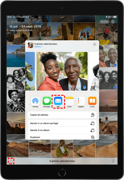 Étape 3. Vous pouvez envoyer jusqu'à cinq photos à la fois. Cliquez sur le bouton de Partager dans le coin inférieur gauche, puis Mail, ce qui ouvrira l'application Mail et une nouvelle fenêtre de message avec les photos que vous avez sélectionnées. Saisissez une adresse électronique pour recevoir les photos.