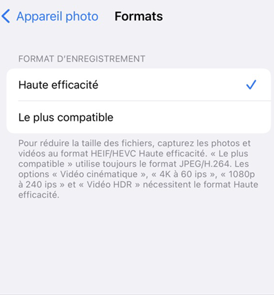 Pour modifier le format de vos vidéos 4K, ouvrez Réglages sur l'iPhone > trouvez et sélectionnez Appareil photo > sélectionnez Formats > sélectionnez Haute efficacité.