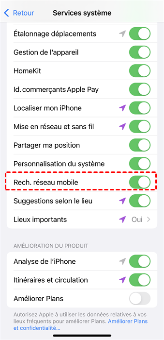 Certains utilisateurs ont réussi à résoudre le problème de WiFi ne fonctionnant pas après la mise à jour iOS 16 et 15 en désactivant les services de réseau WiFi. Allez dans Réglages > Appuyez sur Confidentialité > Appuyez sur Services de localisation > Appuyez sur Services système > Rech. réseau mobile et désactivez-le. Lorsque le problème est résolu, vous pouvez réactiver cette fonctionnalité selon vos besoins.