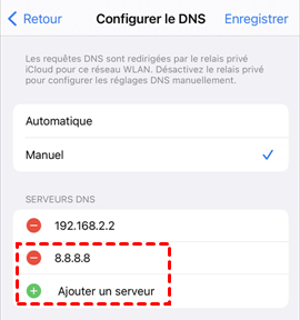 Allez dans Réglages > Appuyez sur WiFi > Appuyez sur (i) à côté du nom du réseau WiFi > Appuyez sur Configurer le DNS > Appuyez sur Manuel > Appuyez sur Ajouter un serveur > Saisissez GoogleDNS (8.8.8.8 ou 8.8.4.4) ou OpenDNS (208.67.222.222 ou 208.67.222.220).