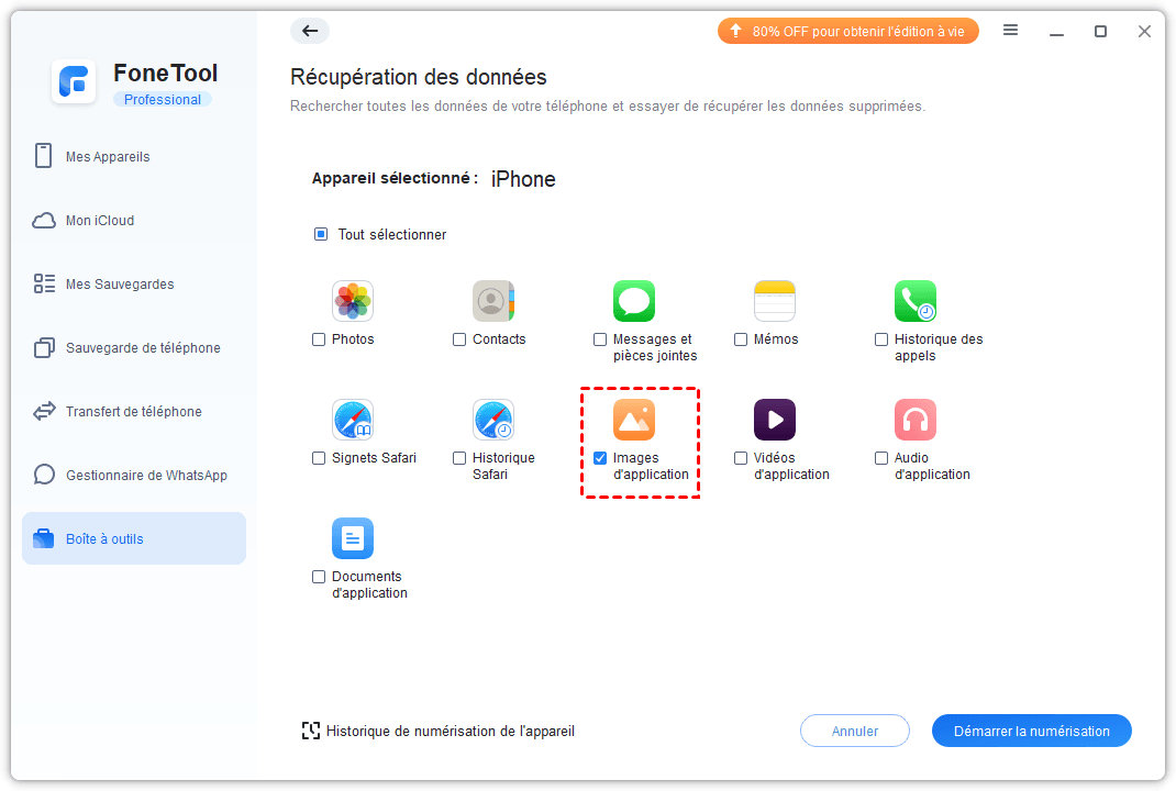 Étape 2 : Cliquez sur l'icône Images d'application, puis sur Démarrer la numérisation pour lancer le processus afin d'analyser les données de votre iPhone.