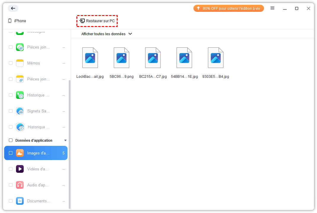 Étape 3 : Une fois l'analyse terminée, rendez-vous sur l'icône App Images pour sélectionner les photos à récupérer. Ensuite, cliquez sur Restaurer sur PC pour les récupérer sur votre PC.