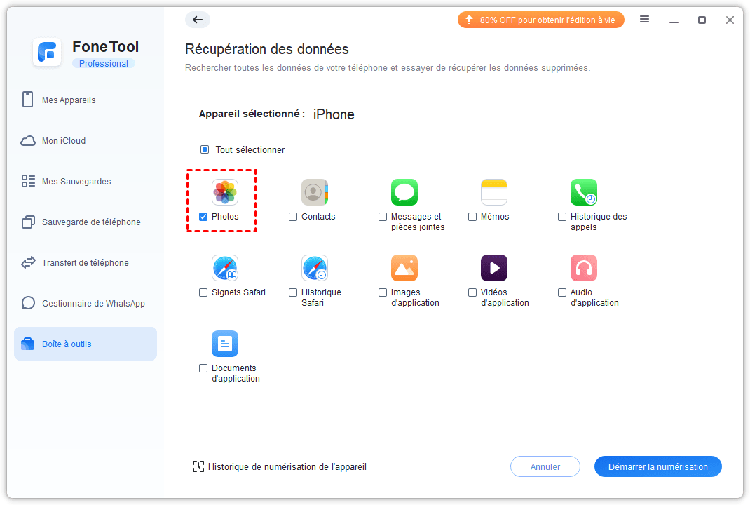 Si vous n'avez pas de sauvegarde iTunes ou d'accès à un ordinateur synchronisé, vous pouvez toujours récupérer des données d'un iPhone verrouillé ou désactivé en utilisant un logiciel de récupération de données tiers. Nous vous recommandons ici FoneTool, logiciel de récupération de données iPhone puissant et fiable, qui vous permet de numériser et de récupérer des fichiers supprimés de l'iPhone, y compris des photos, des contacts, des messages, et même l'historique de Safari, des fichiers multimédias dans les applications, etc. De plus, en cas d'un iPhone verrouillé, vous pouvez d'abord essayer de déverrouiller votre iPhone avec le nouvel outil de FoneTool.