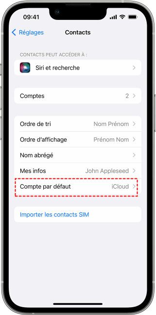 Si vous aviez précédemment désigné Gmail comme compte par défaut, vous pouvez revenir à iCloud pour récupérer vos contacts perdus. Suivez ces étapes :