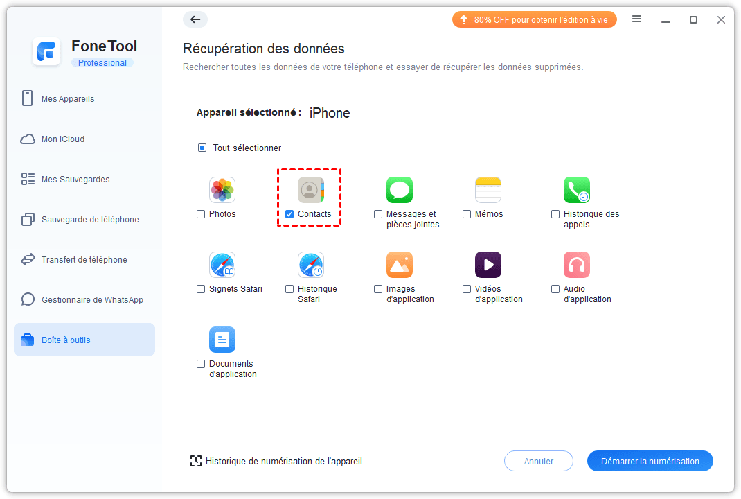 Étape 3 : Sur la page suivante, cochez Contacts > Cliquez sur Démarrer la numérisation pour permettre à FoneTool de scanner tous vos contacts iPhone en profondeur.