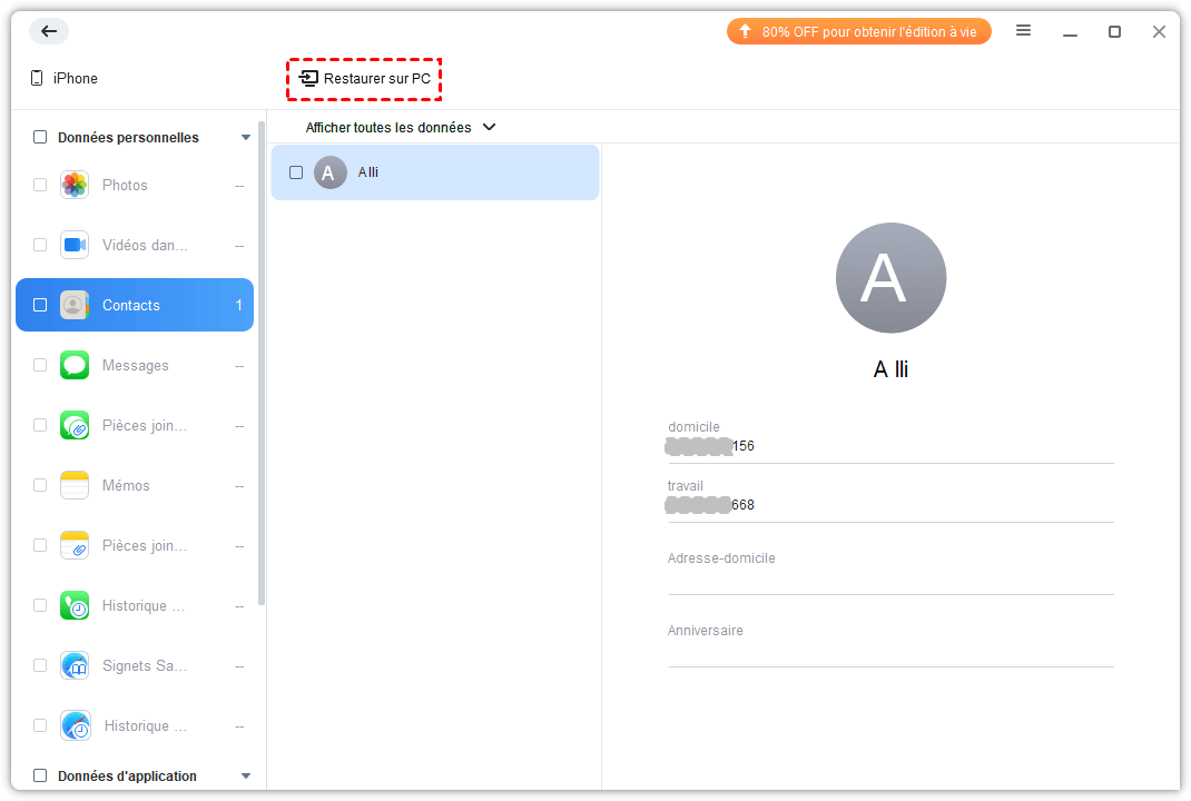 Étape 4 : À partir de là, vous pouvez voir tous les contacts sur votre iPhone. Si vous avez des contacts dont vous avez besoin, vous pouvez simplement les choisir et appuyer sur Restaurer sur PC pour les enregistrer sur votre ordinateur.