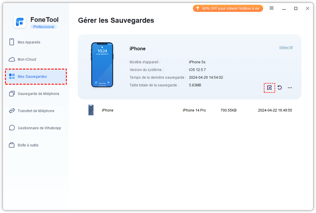 Étape 3. Choisissez une sauvegarde que vous souhaitez restaurer. Les données supprimées sont récupérées avec succès sur votre iPhone.