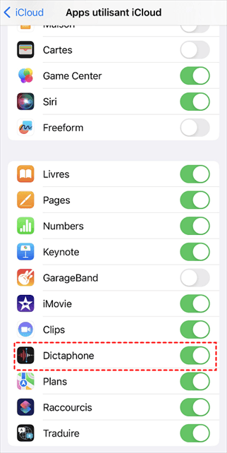 Si vous avez activé la synchronisation iCloud de Dictaphone par défaut, ils seront conservés dans iCloud. Cela signifie que votre sauvegarde iCloud ne contiendra pas vos mémos vocaux. Par conséquent, désactivez iCloud avant de restaurer les données à partir de votre sauvegarde iCloud. Comme le montre l'image ci-dessous.