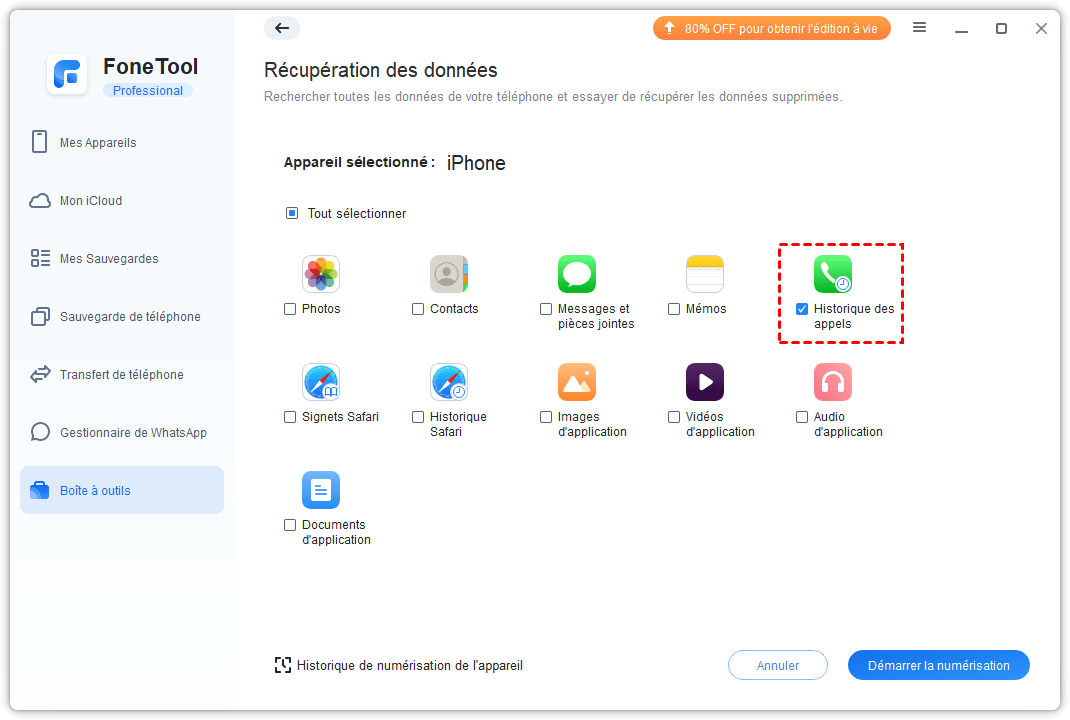 Étape 2. Cochez la case de l'historique des appels et des autres types de fichiers que vous souhaitez récupérer, puis appuyez sur Démarrer la numérisation pour commencer le processus d'analyse.