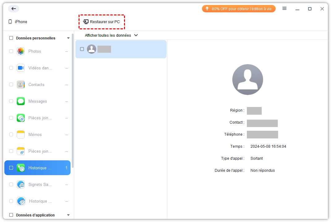 Étape 3. Une fois l'analyse terminée, vous pourrez prévisualiser les fichiers récupérables. Choisissez l'historique des appels perdus que vous souhaitez récupérer et appuyez sur Restaurer sur PC pour les sauvegarder sur votre ordinateur.