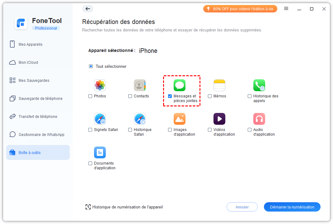 Il est donc fortement recommandé d'utiliser FoneTool qui est un outil de récupération de données iPhone sûr et professionnel . Avec FoneTool, vous pouvez facilement récupérer les données supprimées de votre iPhone telles que les messages, les contacts, l'historique des appels, les photos, les vidéos, etc.