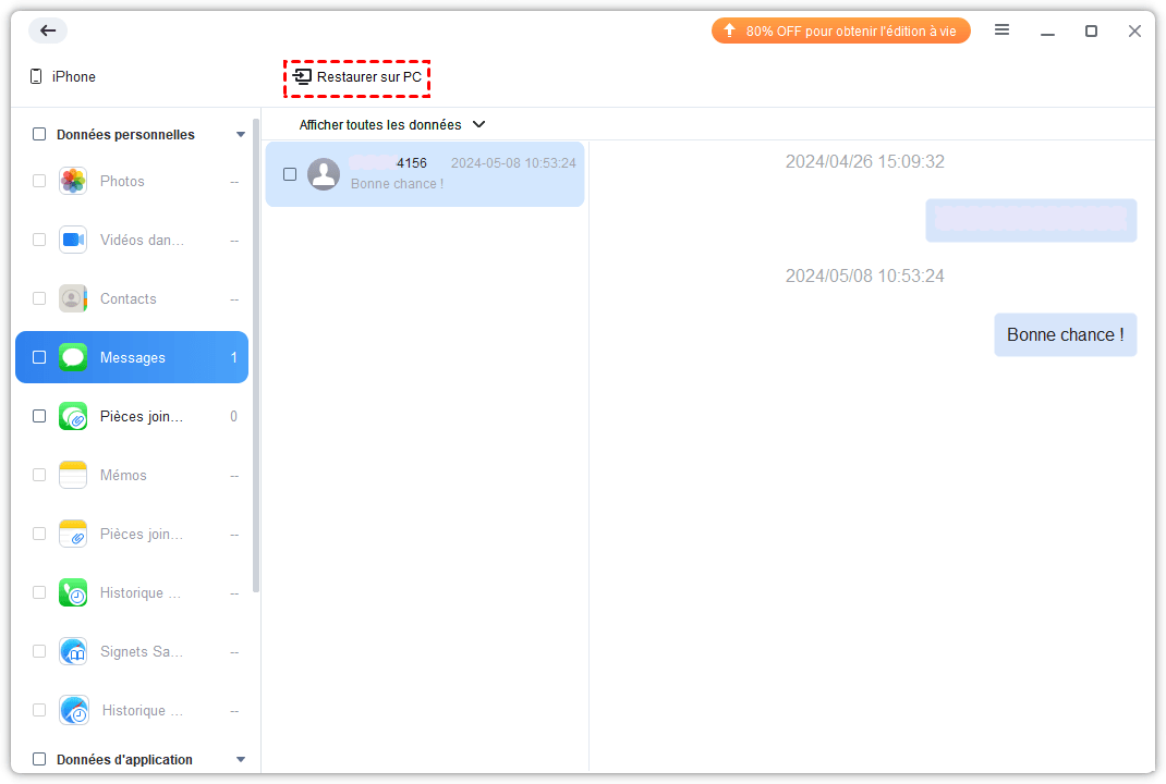 Étape 4 : Sélectionnez les SMS que vous souhaitez récupérer > Cliquez sur l'option Restaurer sur PC pour récupérer avec succès les SMS de votre iPhone.