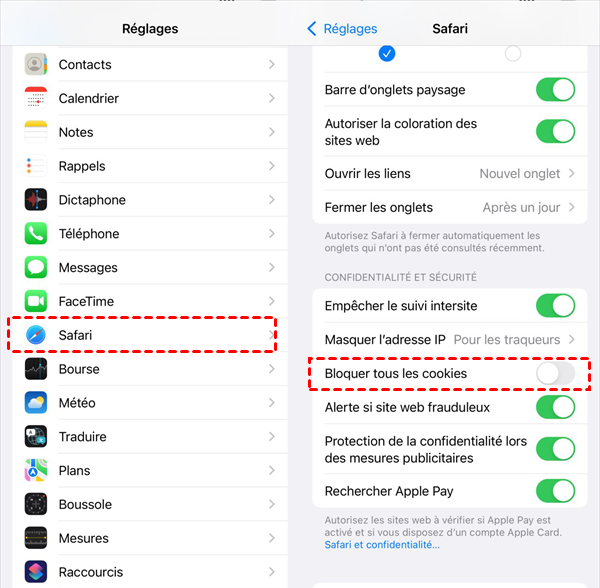 Étape 1. Allez dans Réglages de votre iPhone > Safari > Faites défiler jusqu'à la section CONFIDENTIALITÉ ET SÉCURITÉ, désactivez Bloquer tous les cookies.