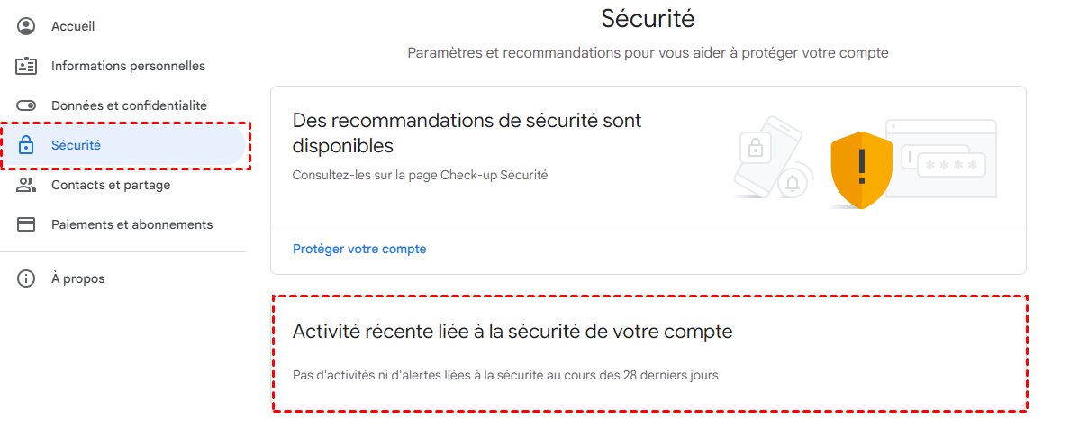 Étape 1. Allez sur https://myaccount.google.com/ > Cliquez sur Sécurité dans le volet de gauche > Cliquez sur Activité récente liée à la sécurité de votre compte.