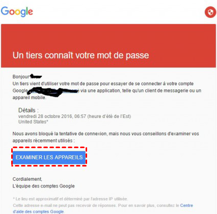 Étape 2. Recherchez une boîte d'alerte ou un e-mail indiquant quelque chose comme Tentative de connexion bloquée ou Un tiers connaît votre mot de passe.
