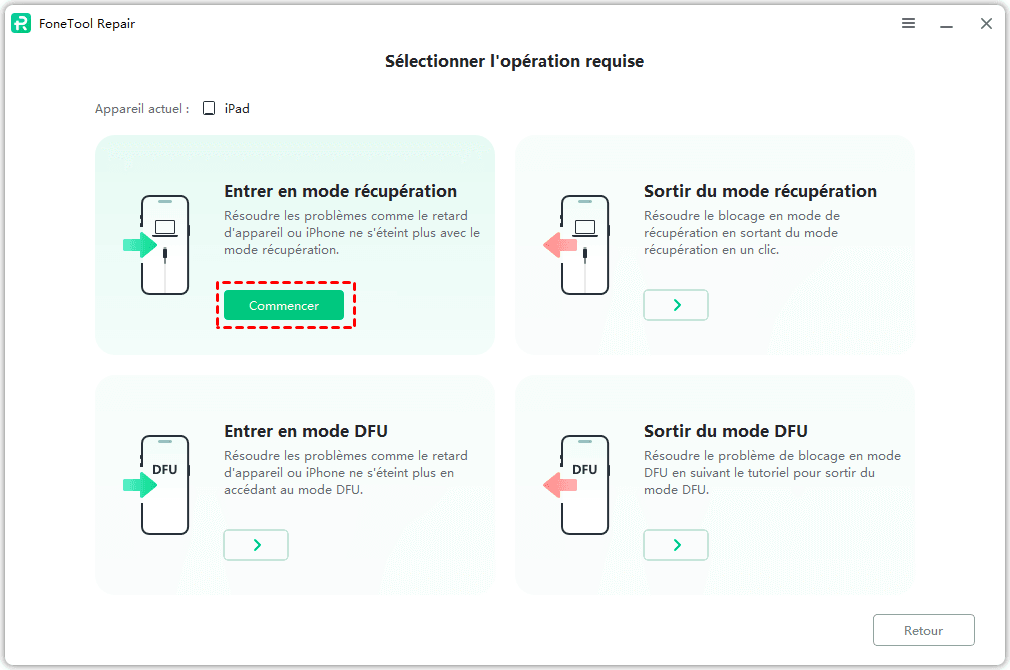 Étape 2. Choisissez Entrer mode récupération. Cliquez sur Commencer. FoneTool Repair va commencer à mettre votre iPhone en mode de récupération automatiquement.