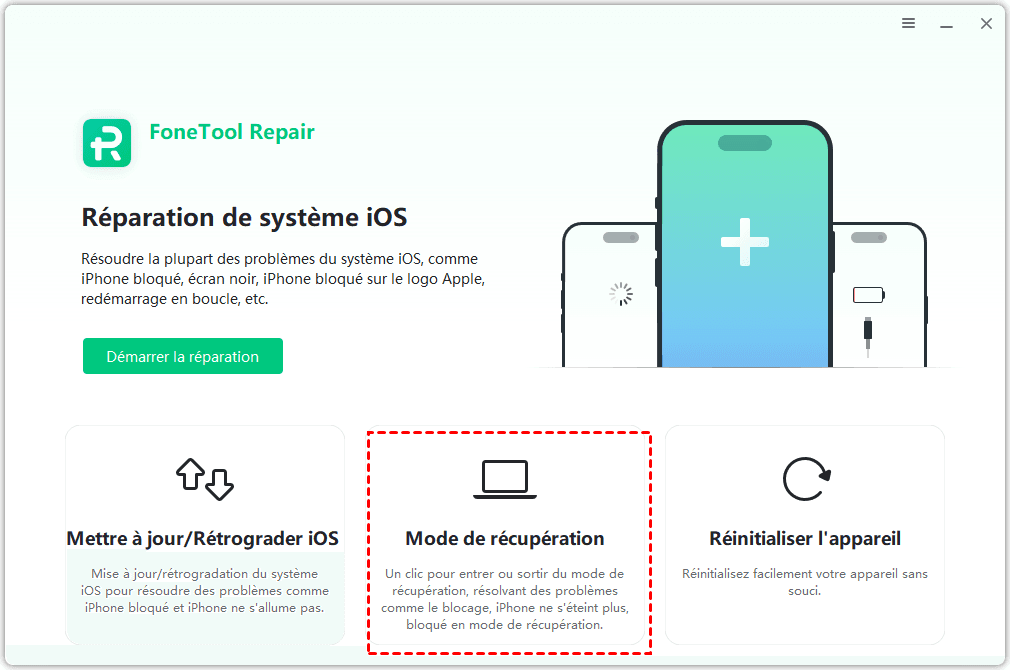 Étape 1. Connectez votre iPhone à l'ordinateur > Lancez FoneTool Repair > Choisissez Mode de récupération pour continuer.