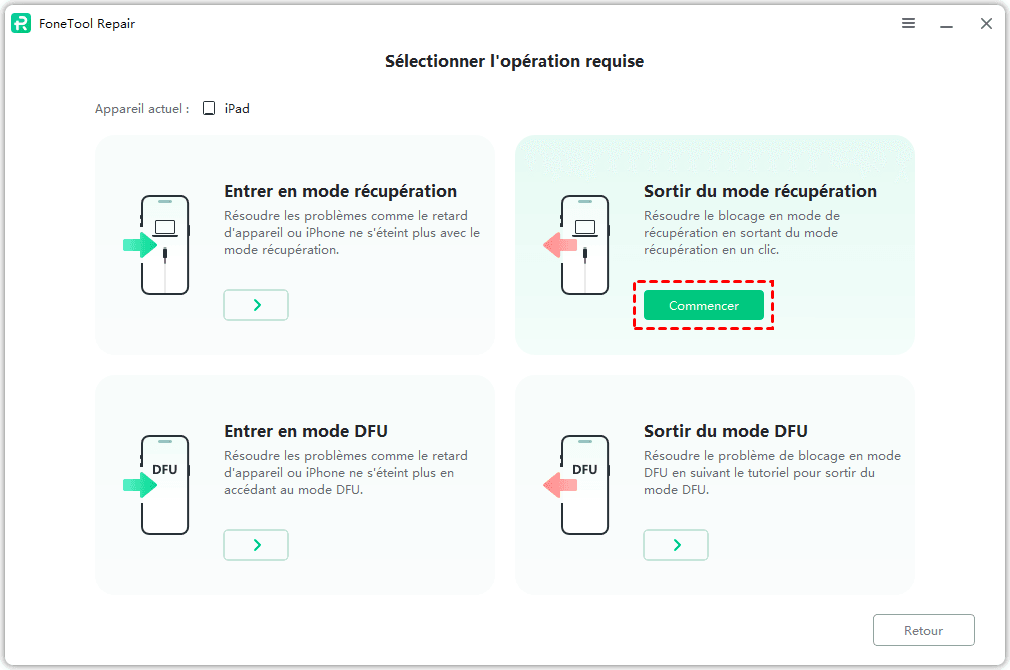 Accédez à Mode de récupération, choisissez Sortir du mode récupération. Cliquez sur Commencer. Votre iPhone sera sorti du mode de récupération automatiquement.