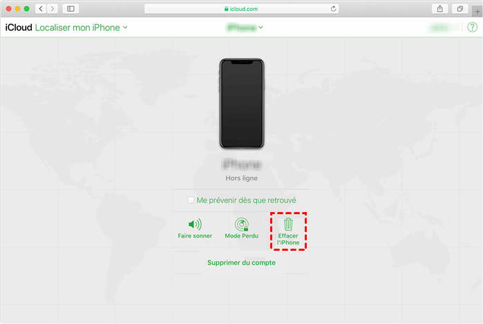 Étape 2. Cliquez sur l'option Tous les appareils > Localisez et cliquez sur votre iPhone > Cliquez sur Effacer l'iPhone pour l'effacer.