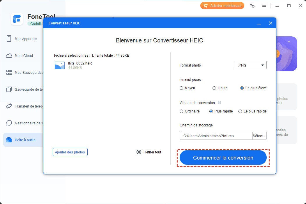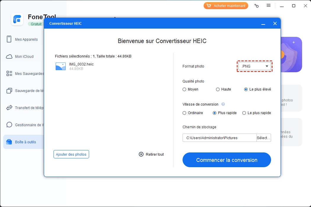 FoneTool est un outil professionnel de gestion des données iOS qui propose des solutions de sauvegarde et de transfert de données. Récemment, il a ajouté Convertisseur HEIC qui aide les utilisateurs à convertir facilement HEIC en PNG, JPG ou JPEG.