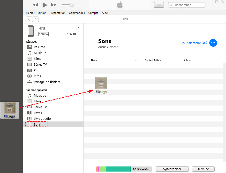 ● Si votre version d'iTunes prend en charge la gestion des sonneries, vous pouvez simplement faire glisser le fichier m4r dans la section Sons et synchroniser les sonneries avec votre iPhone. Ensuite, vous pouvez aller dans l'application Réglages pour choisir la sonnerie que vous avez créée.