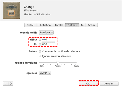● Allez dans Morceaux ou Ajouts récents pour trouver le fichier MP3 que vous souhaitez convertir > Cliquez avec le bouton droit sur la chanson et choisissez Informations sur le morceau > Dans la nouvelle fenêtre, choisissez Options > Cochez la case à côté de début et fin > Indiquez le moment précis du début et de la fin du morceau. Il doit s'agir d'une période de 30 secondes dans la chanson que vous souhaitez utiliser comme sonnerie > Cliquez sur OK pour confirmer.
