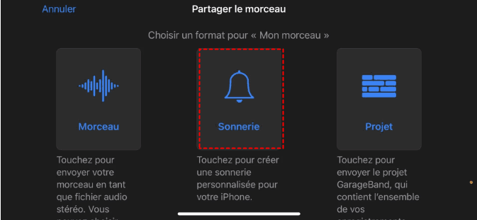 ● Donnez un nom à la sonnerie > Appuyez sur Exporter > Ensuite, appuyez sur Utiliser comme... > Définissez la sonnerie comme Sonnerie standard, Son SMS standard ou Assigner à un contact, ou appuyez sur OK et allez dans Réglages > Sons et vibrations > Sonnerie pour changer la sonnerie de votre iPhone.