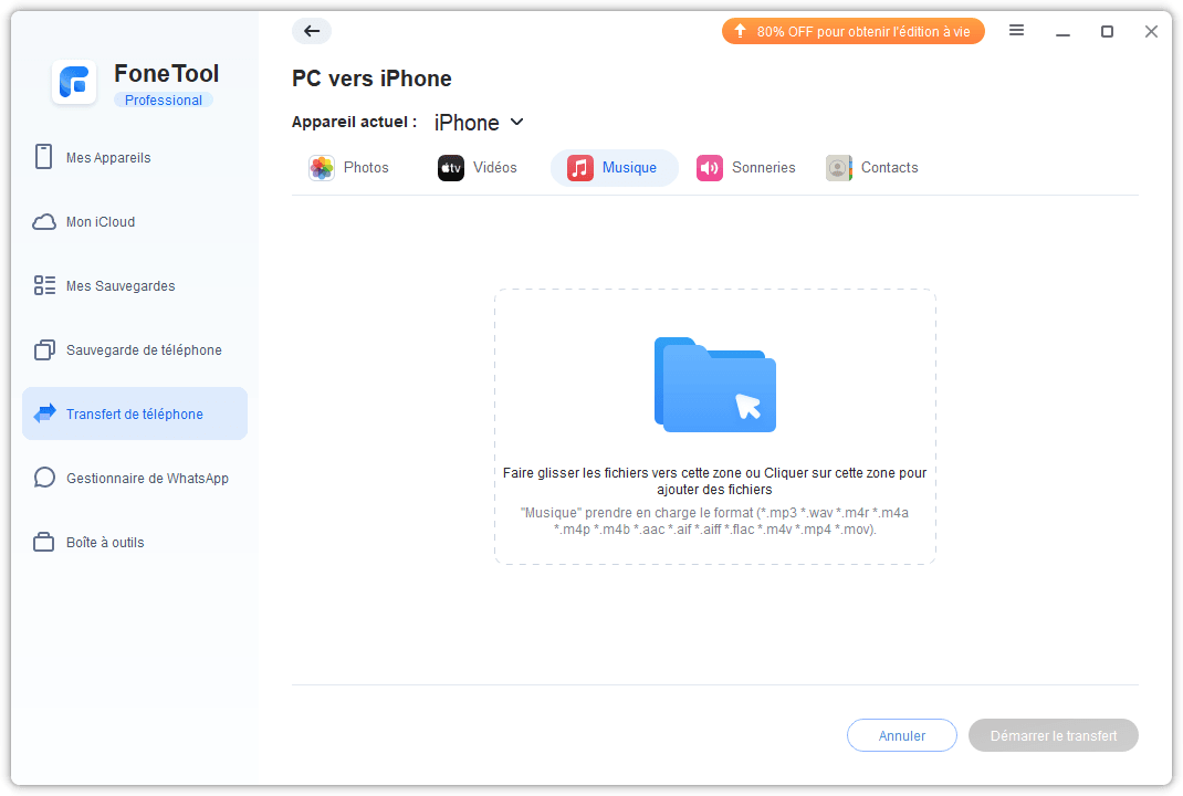 La manière la plus simple de transférer des fichiers MP3 sur votre iPhone est d'utiliser un outil de transfert. Nous vous recommandons FoneTool, un outil professionnel de transfert de données pour iPhone destiné aux utilisateurs de Windows. Cet outil vous permet de transférer des fichiers MP3 vers l'application Apple Music sans effacer les chansons existantes sur votre iPhone.