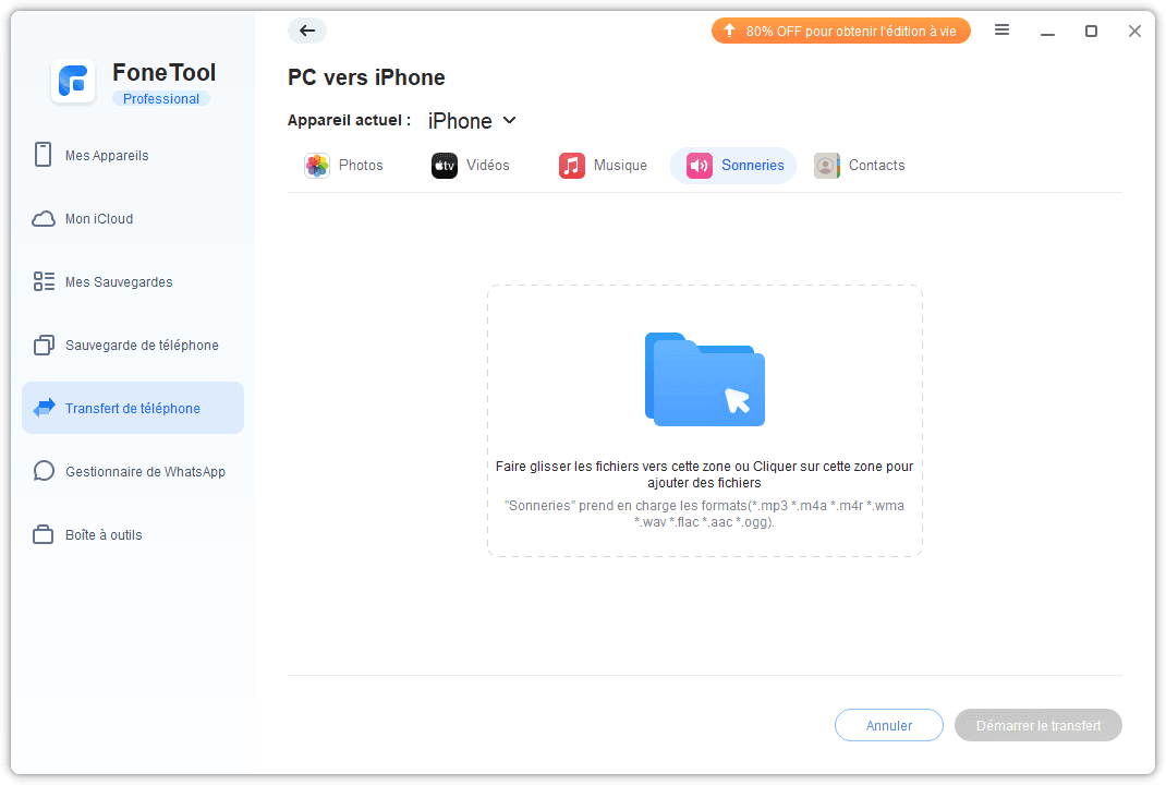 De plus, FoneTool peut vous aider aussi à transférer directement des sonneries de votre PC vers votre iPhone. Il vous suffit d'aller dans Transfert de téléphone > PC vers iPhone > Démarrer le transfert pour transférer les fichiers de votre PC vers votre iPhone.