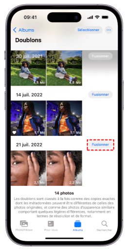 Étape 3 : Vous verrez toutes les photos en doublon. Maintenant, vous pouvez appuyer sur Fusionner pour supprimer les photos en doublon.