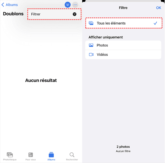 Vous pouvez aller dans l'album Doublons > Appuyez sur l'icône des trois points > Choisissez Filtrer pour voir si les réglages sont corrects. > S'il affiche uniquement Photos ou Vidéos, sélectionnez Tous les éléments.