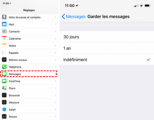 Si vous avez activé la synchronisation des messages, tous les messages et pièces jointes de l'iPhone seront envoyés à l'iPad. Lorsque vous constatez que l'espace de stockage de l'iPad est plein, vous pouvez supprimer certains anciens messages. Pour que les messages soient supprimés automatiquement, vous pouvez aller dans Réglages > Messages > Garder les messages et choisir 30 jours.