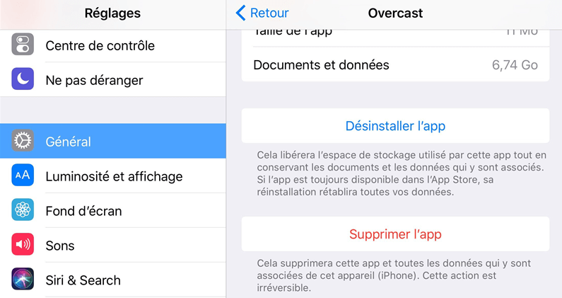 Sur l'écran de Stockage iPad, choisissez une application dont vous n'avez pas besoin > touchez l'option Désinstaller l'app pour supprimer l'application de l'iPad ou touchez Supprimer l'app pour supprimer l'application et toutes les données qui s'y rapportent. Avant de procéder à la suppression, vous pouvez vérifier l'espace utilisé par l'application elle-même et la taille des données générées par l'application.