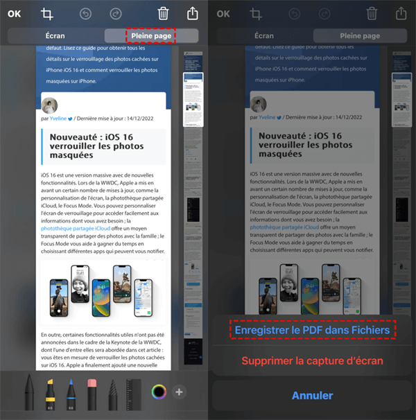 • Enregistrer la capture d'écran : Appuyez sur Terminé pour enregistrer votre modification. Vous pouvez l'enregistrer dans l'application Photos ou Fichiers.