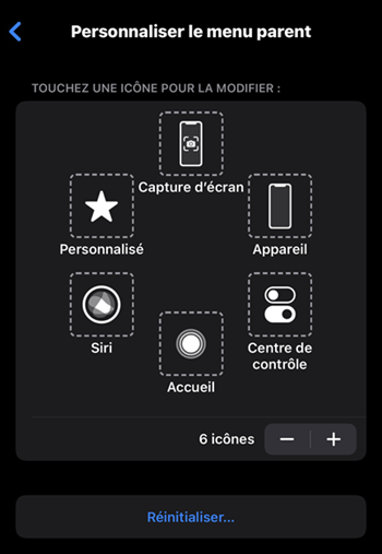 Étape 3. Vous pouvez appuyer sur Personnaliser le menu parent et cliquer sur le bouton + pour ajouter Capture d'écran au menu AssistiveTouch.