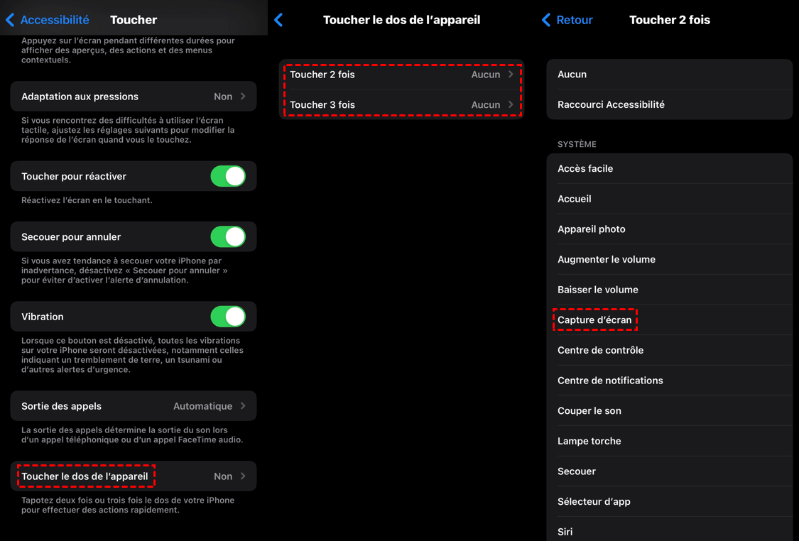 Allez dans Réglages > Tapez sur Accessibilité > Tapez sur Toucher > Tapez sur Toucher le dos de l'appareil > Choisissez Toucher 2 fois ou Toucher 3 fois > Sélectionnez Capture d'écran.